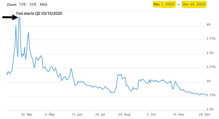 That unprecedented round of quantitative easing (QE) was a major move to restore confidence and keep credit flowing during one of the most uncertain economic moments in history. It also led to mortgage rates dropping to historic lows. The chart below shows just how dramatically rates dropped from March through December 2020: