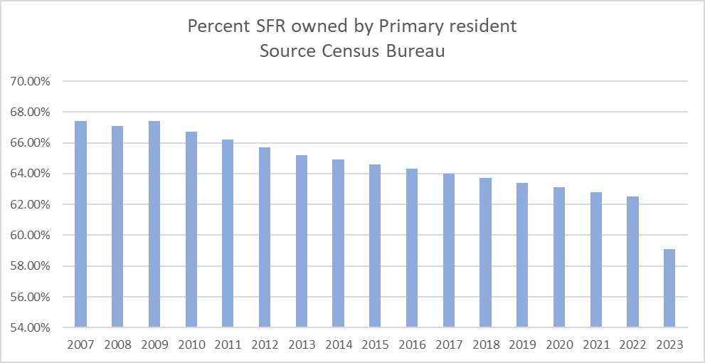In a surprising development, the percentage of homes owned by primary residents has dropped below 60%. The increasing influx of investors into residential real estate is becoming a very concerning trend.