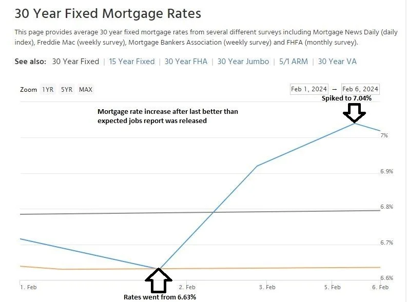 The main event this week will be the February jobs reports set to be released on Friday morning at 8:30 AM. Shall we recap the chaotic events that occurred when the last jobs report was released in the beginning of February? The U.S. labor market annihilated expectations by creating double the number of jobs anticipated by economists. This caused mortgage rates to surge by nearly 0.5% within days (chart 1). A strong and resilient labor force is bad for mortgage rates.